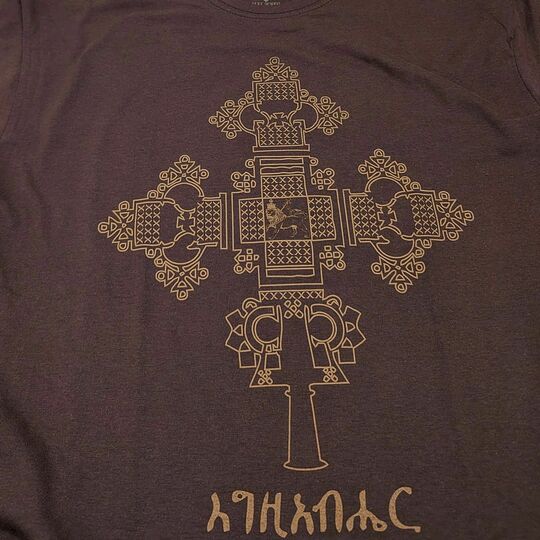 Potlač vyrobená technikou sítotlače zobrazuje etiópsky kríž doplnený o amharský nápis እግዚአብሔር, čo znamená „Pán vesmíru“ alebo „Chváľte Jah“.