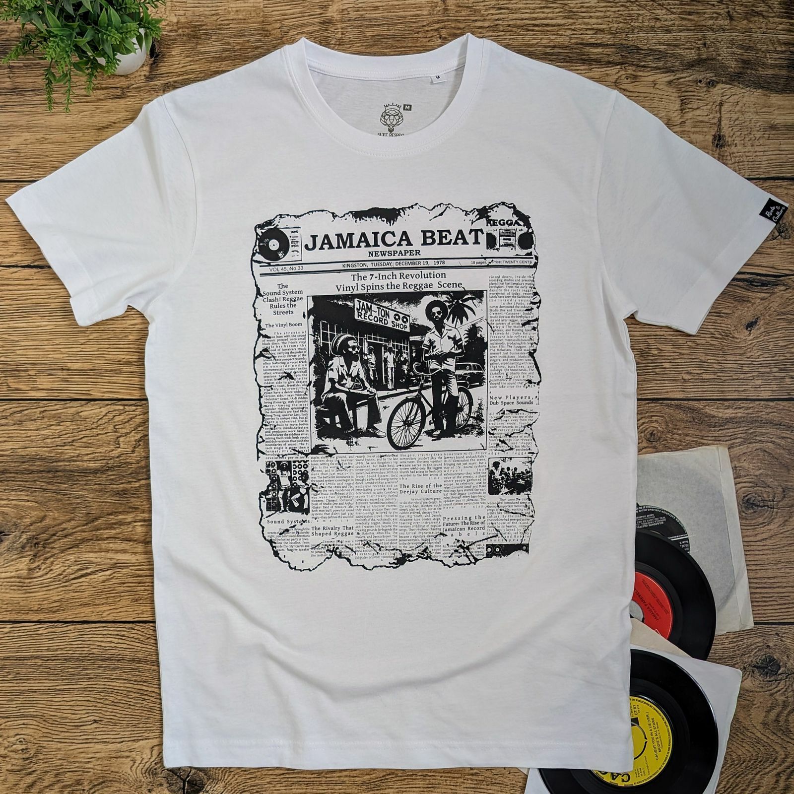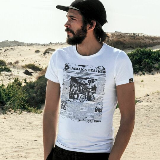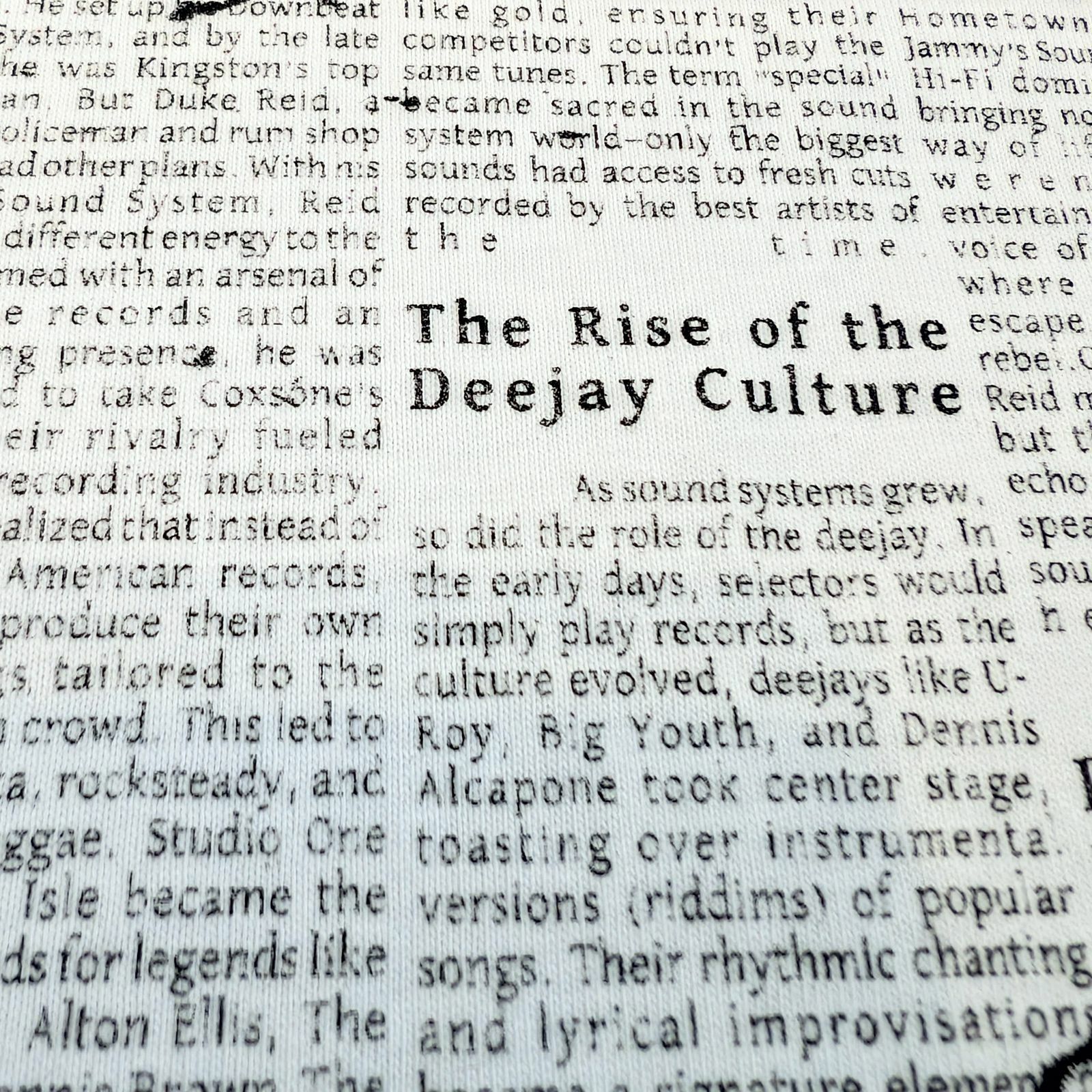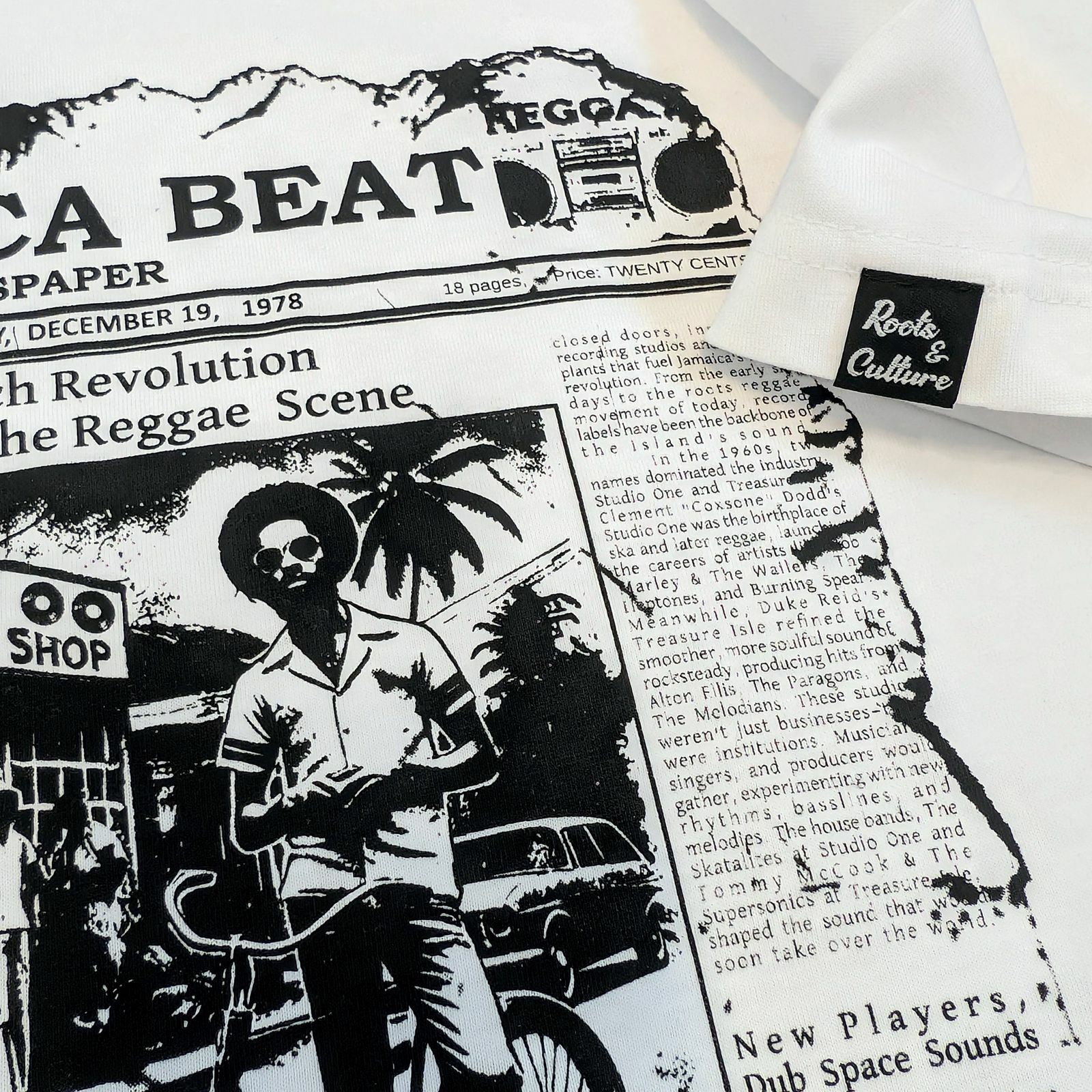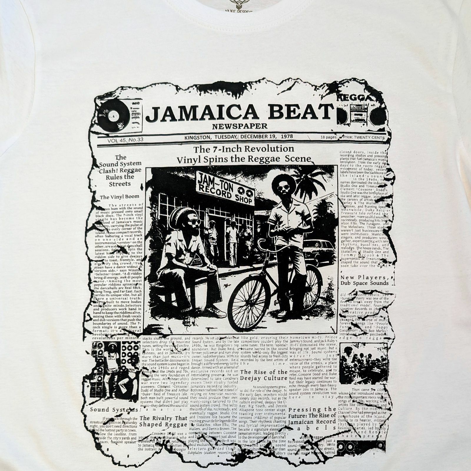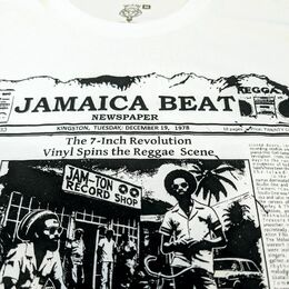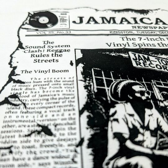 Autorská grafika pripomínajúca staré noviny „Jamaica Beat“ zobrazuje úryvky článkov o rozmachu vinylových vydavateľstiev, kultúre sound systémov a zrode deejayingu.