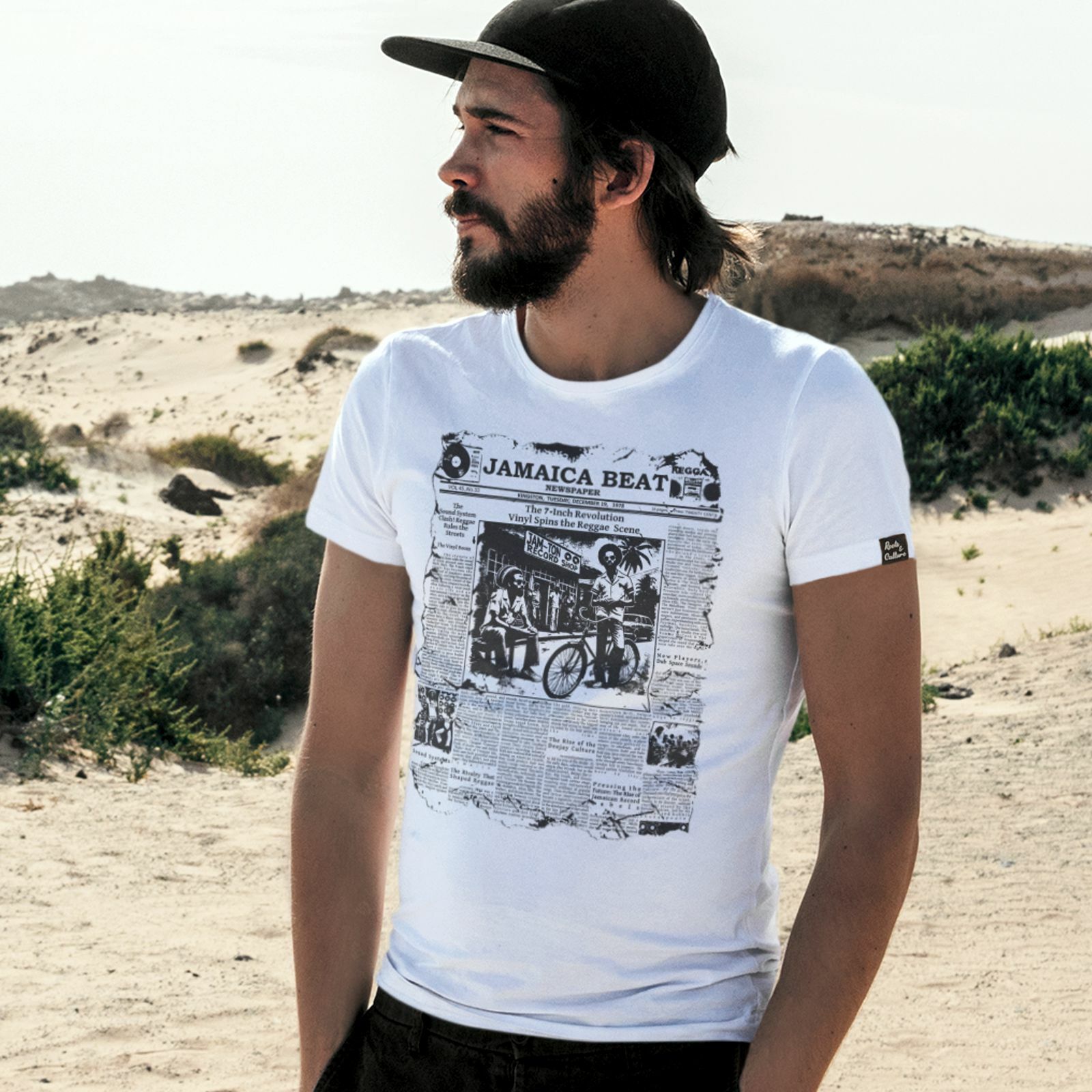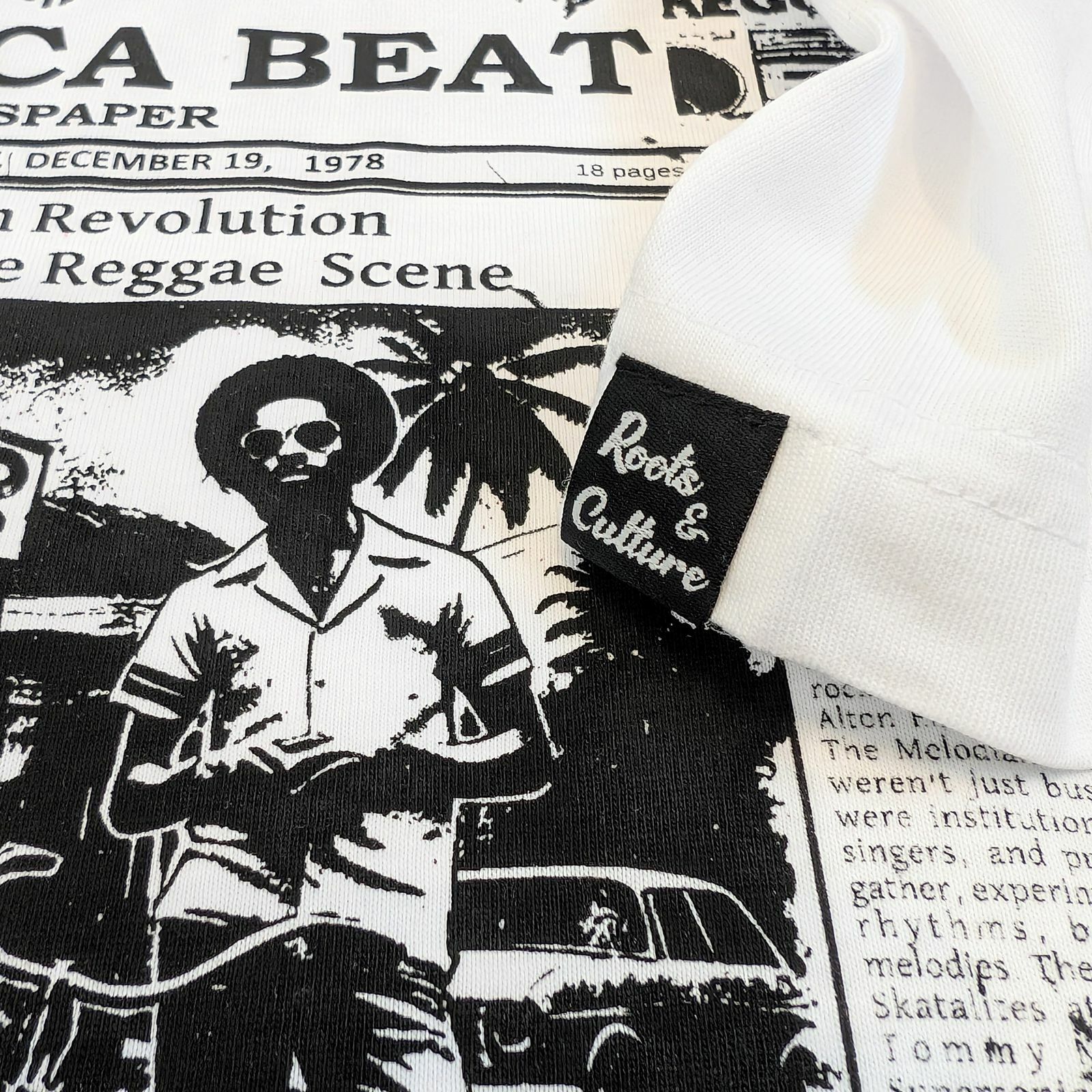 Na ľavom rukáve sa nachádza decentná tkaná etiketa s nápisom „Roots & Culture“, ako pocta tradícii jamajských koreňov.
