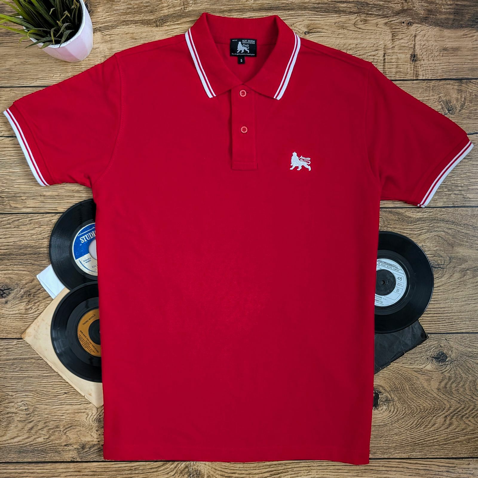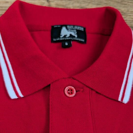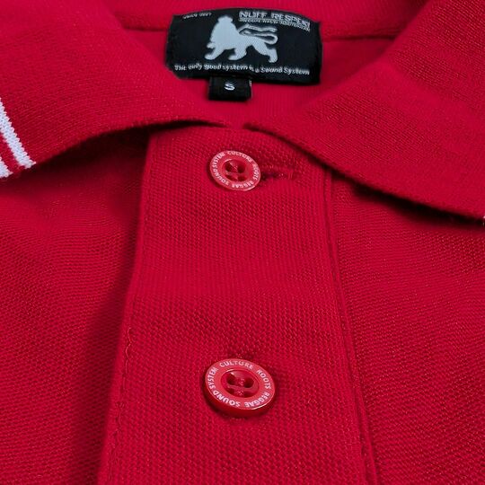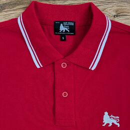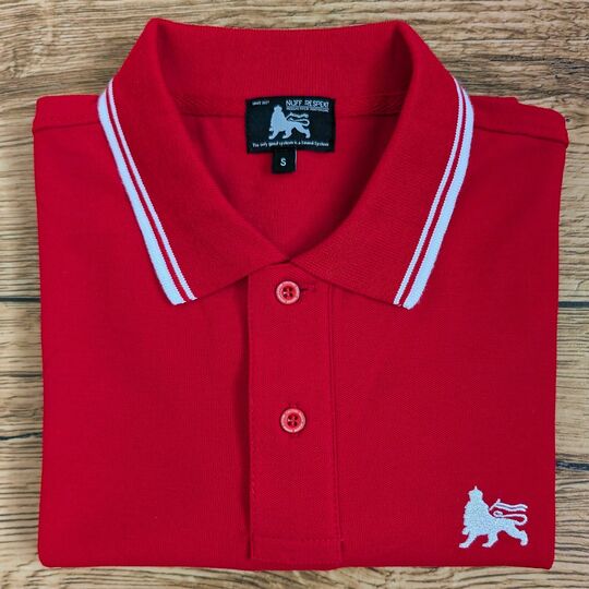 Elegantné polo tričko v žiarivej červenej farbe s jamajským duchom a symbolom Leva Judy – ideálne spojenie klasiky a roots reggae štýlu.